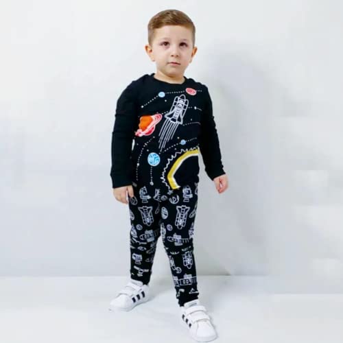 Bricnat Pigiama a maniche lunghe in cotone, per bambini, set di biancheria da notte con dinosauro, squali, cielo stellato, camion dei pompieri, 2 pezzi Nero 120 Centimetro