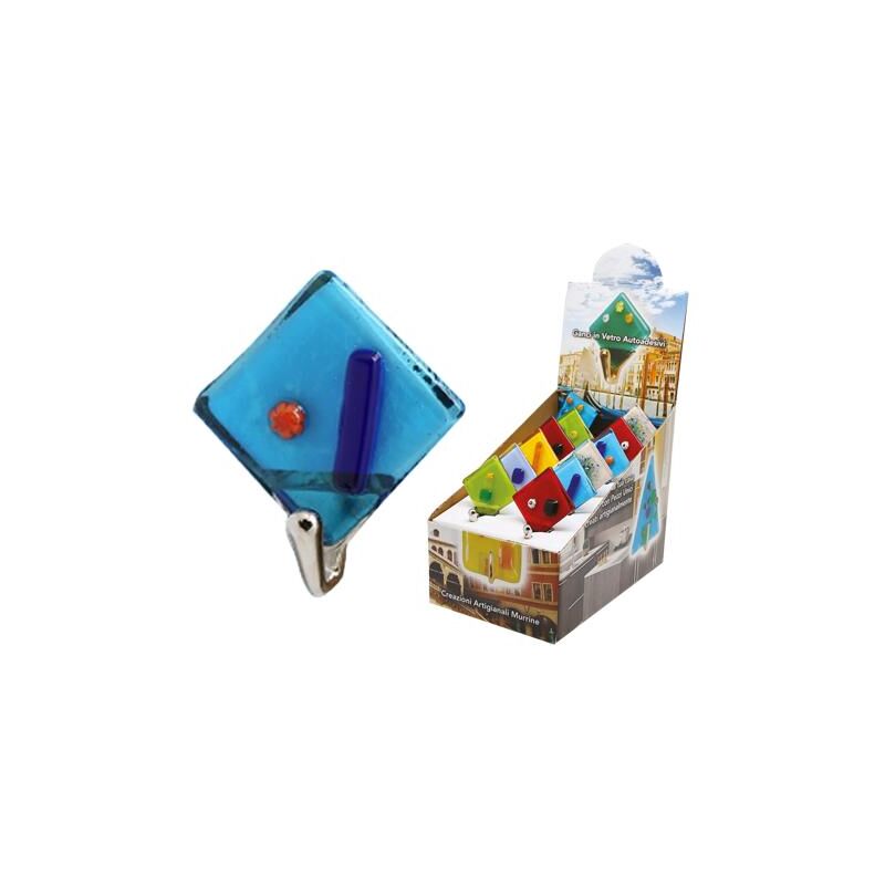 Ganci appenditutto adesivi vetro murano Ganci adesivi in vetro di murano 40x40 mm. Pezzi 40 vari colori in display box L12,5xP21xH16/31 cm.