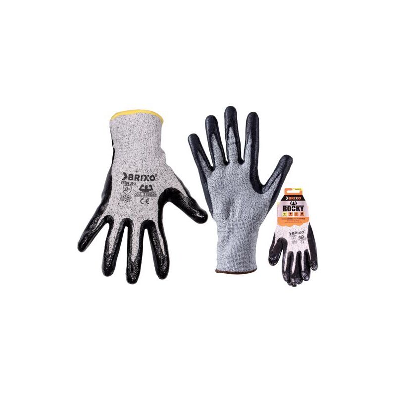 Guanti Brixo Rocky Cotone/Nitrile Dorso cotone, palmo nitrile resistente al taglio. Alto livello di protezione meccanica, polso elastico, dorso areato. Utilizzi: Iniezione e stampaggio materiali plastici, industria del vetro, industria automobilstica. Certificazioni EN388:2016 - 4244B-EN420 Taglia XL