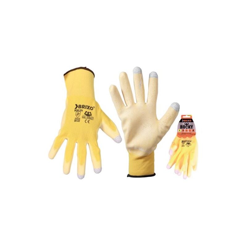 Guanti Brixo Rocky con Touch Poliestere/PU Dorso poliestere, palmo poliuretano con touch sulle dita per uso smartphone, buona trasmissione del calore, forma ergonomica. Utilizzi: con dispositivi touch screen, assemblaggio microcomponenti elettrici, applicazioni di laboratorio. Certificazioni EN388:2016 - 3131X-EN420 Taglia L