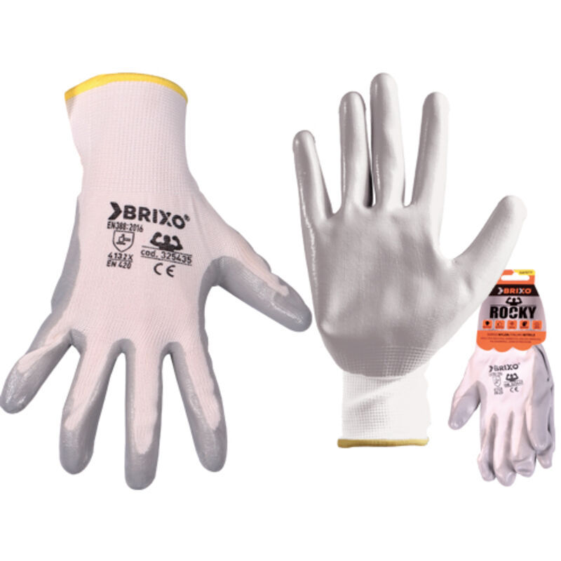Guanti Brixo Rocky Poliestere/Nitrile Dorso poliestere, palmo nitrile. Ottima resistenza alle abrasione, forma ergonomica. Utilizzi: lavorazioni e assemblaggi di piccoli pezzi scivolosi, industria automobilistica, logistica & magazzino, manutenzione generale. Certificazioni EN388:2016 - 4132X-EN420 Taglia XXL