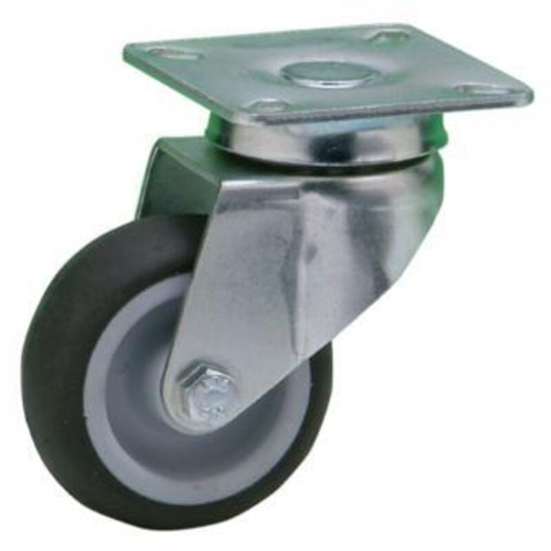 Ruote con supporto a piastra Art. 601 NG Supporto in acciaio stampato nichelato rotante su doppia corona di sfere, con gomma nera mm. 20, rotante su boccola in acciaio. Piastra 40x40 mm. Ø 50 mm. - HL 68 mm. - Portata max kg. 25