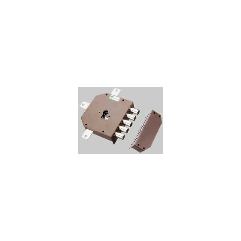 Serratura quintuplice da applicare con aste (non in dotazione) con scrocco con predisposizione per cilindro europeo. Corsa chiavistelli mm. 29. Corsa aste mm. 17. Apertura esterna con chiave ed interna con chiave o pomolo in funzione del cilindro applicato. Dimensione scatola mm. 132x146. In dotazione 3 chiave.