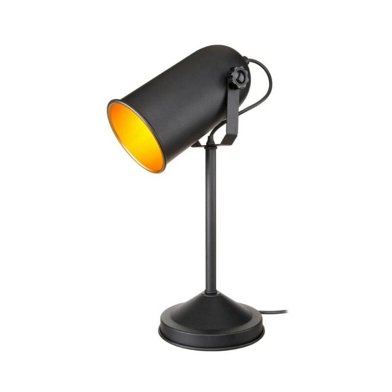 Elegantissima lampada da tavolo in metallo di colore nero verniciata a polvere elettrostatica. Lampada alta 42 cm e larga 16 cm dal design industrial, paralume orientabile lungo 23 cm e all'interno verniciato color oro ideale da installare sulla scrivania dell'ufficio o una camera per ragazzi. Attacco per lampadina 1x E27 max 60 Watt, interruttore on/off, prodotto facile da pulire e da assemblare. Caratteristiche Tecniche: Dimensioni ingombro (LxPxH): 16x23x42 cm Materiale: metallo e vetro Attacco: E27 max 60 Watt Colore: nero La lampadina non è inclusa nella confezione.