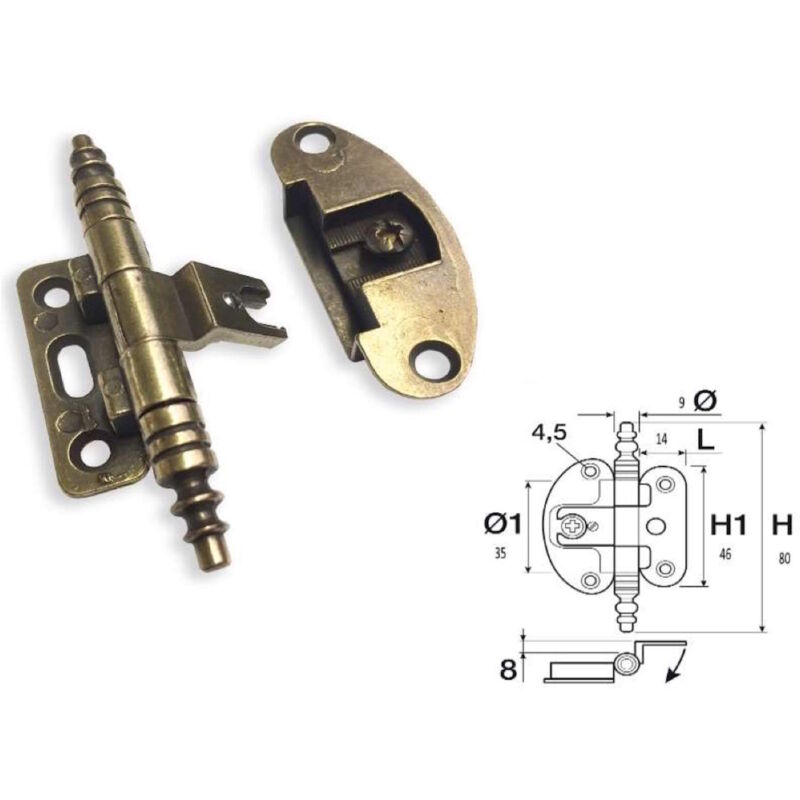 Cerniera in zama per ante in battuta con snodo diametro 9 mm. CERNIERA ART.621 MM.105 BRONZO COMPLETA H: 80 H1: 46 L: 14 Ø: 9 Ø1: 35