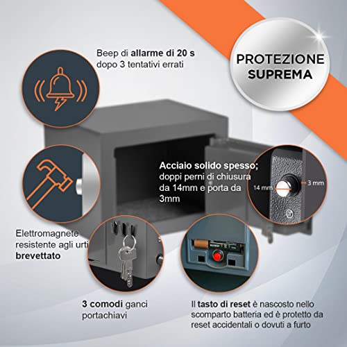 PER LA TUA TRANQUILLITÀ. Cassaforte a muro o pavimento facile da fissare con fori preforati e ferramenta di montaggio (inclusa). Cassaforte elettronica con batterie standard AA (4 incluse). Cassaforte digitale non richiede chiave di accesso ma ha due chiavi di emergenza nel caso la batteria si esaurisca o venga dimenticato il codice pin.
