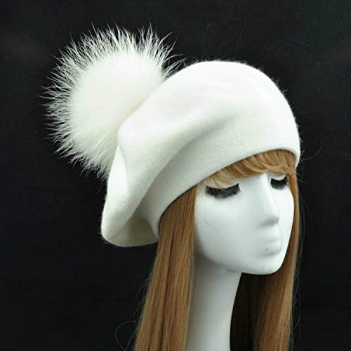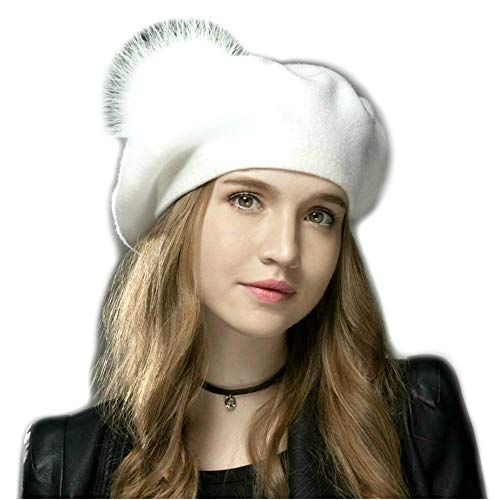 Brillabenny Basco Berretto Pelliccia Vera e Cashmere Cappello Cappellino Cuffia Ragazza Hat cap Fur PON Pom Luxury (Bianco White)