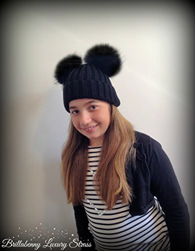 Brillabenny Cappello Pelliccia Vera Doppio PON PON Nero Ragazza Donna Cuffia Berretto Hat Fur Luxury Neve Sci Inverno Regalo Natale