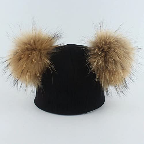 Brillabenny Cuffia Cappello Doppio PON PON Pelo Pelliccia Vera Berretto per Donna Lusso Hat cap Luxury (Nero Beige)