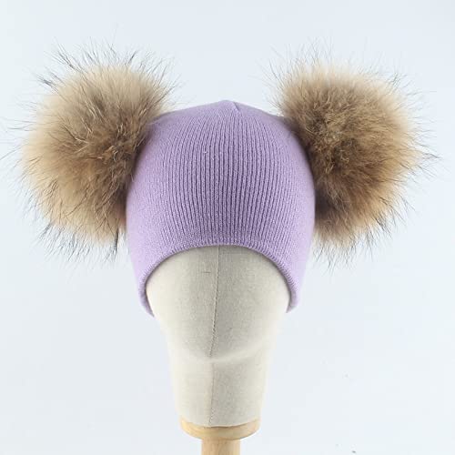 Brillabenny Cuffia Cappello Doppio PON PON Pelo Pelliccia Vera Berretto per Donna Lusso Hat cap Luxury (Viola Beige)