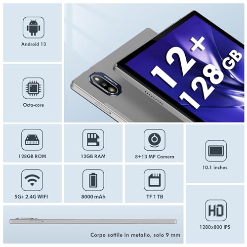 BRILLAR Tablet 10 Pollici, 12GB RAM+128GB ROM(TF 1TB), Android 13 Tablet PC, Octa-Core, 5G WIFI, 8+13MP Fotocamera, 8000mAh Batteria, Grigio