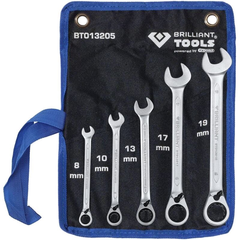 Serie da 5 pz Fabbricata conformemente a DIN 3113 A dentatura fine con 72 denti Angolo di rotazione posteriore di 5° Reversibile Con cromatura opaca Cromo vanadio In una pratica custodia con occhielli di aggancio La serie di chiavi a cricco da 5 pezzi BT013205 di BRILLIANT TOOLS viene fabbricata secondo DIN 3113. Le chiavi poligonali metriche con funzione di cricco presentano una dentatura fine con 72 denti e ha un angolo di rotazione all'indietro di 5°. Le chiavi hanno una testa a cricco reversibile che è angolata di 15°. Anche la posizione della bocca è angolata di 15°. Un'inversione della funzione di cricco (destra/sinistra) avviene in modo confortevole grazie al movimento del commutatore. La superficie è cromata opaca, per cui sta anche particolarmente bene in mano. La serie di chiavi a cricco con le grandezze da 8 mm a 19 mm viene fornita in una pratica custodia che è equipaggiata con occhielli di sospensione. Contenuto: 8 mm, 10 mm, 13 mm, 17 mm, 19 mm LA NOSTRA QUALITÀ