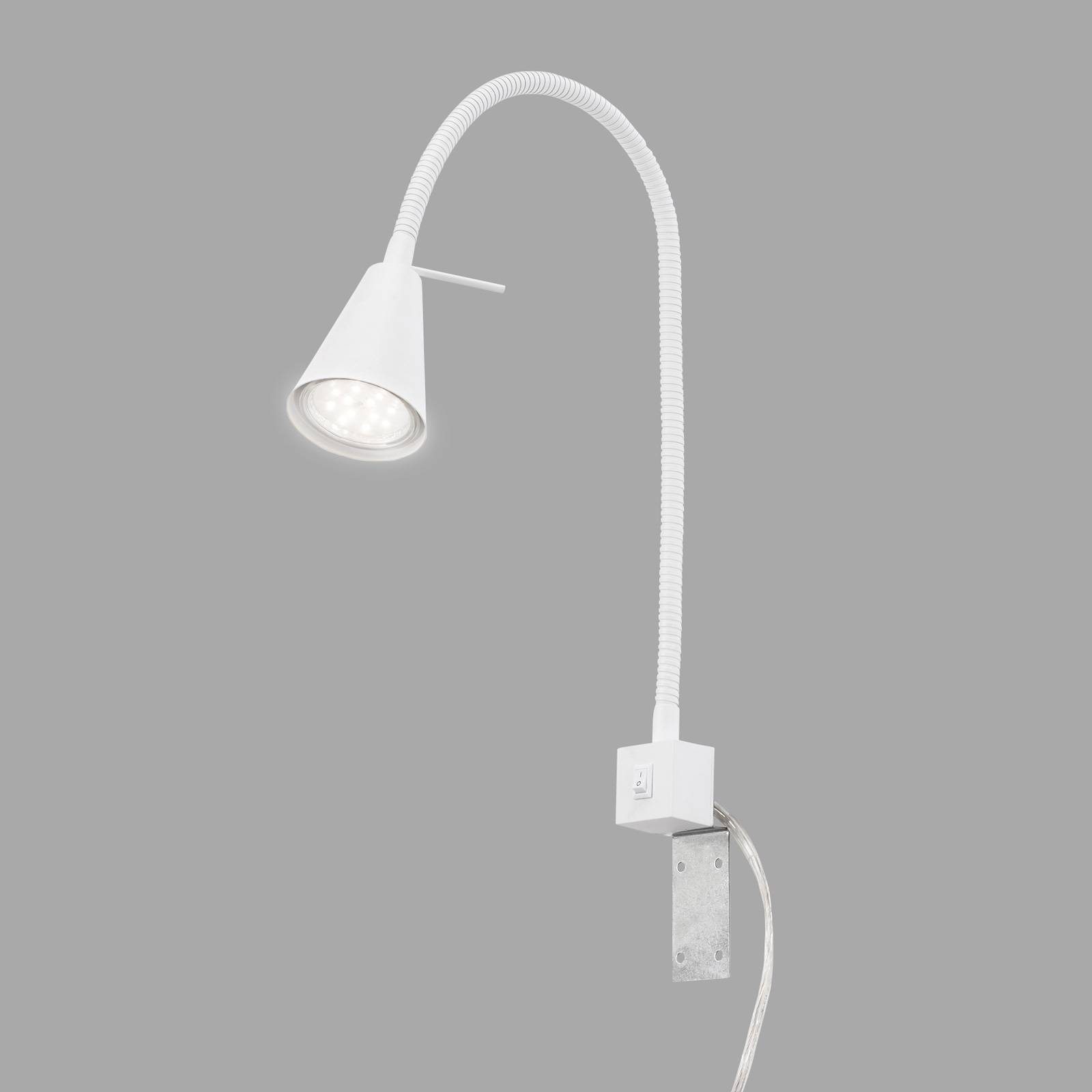 Applique LED 2080 con braccio flessibile e supporto da montare accanto al letto A sinistra, a destra o in alto sopra il letto: con la piastra di montaggio regolabile di 90° si può montare quest'applique LED nel modo preferito. Il lungo braccio flessibile si piega liberamente in modo da concentrare la luce nel modo più indicato per la lettura serale. L'interruttore è inserito nella base angolare e quindi lo si aziona comodamente dal letto. L'applique a LED 2080 viene fornita con una lampadina LED GU10 sostituibile. Il cavo di raccordo trasparente è lungo 180 cm.