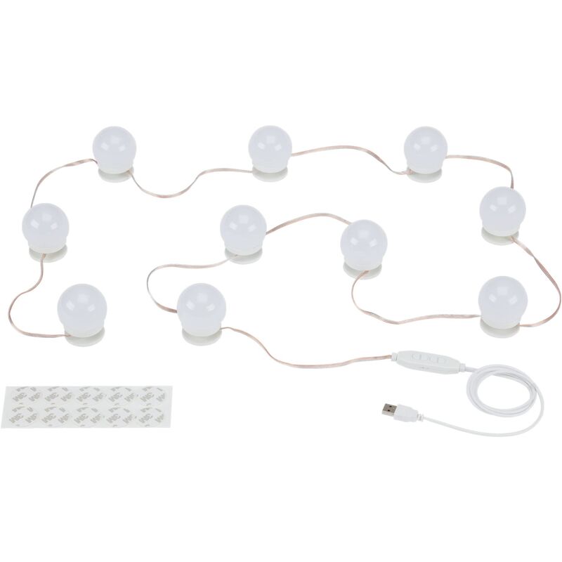 Questa moderna lampada a LED a specchio in stile hollywoodiano, in plastica, diventerà l'elemento principale della vostra toletta o allo specchio del bagno grazie al suo design semplice e bianco. La catena luminosa ha un totale di 10 globi luminosi con 12 LED ciascuno (per un totale di 120 LED) e conlpisce per il suo risparmio energetico totale di 6 watt con un'emissione luminosa totale di 600 lumen (60 lumen per globo). Grazie alla funzione di dimmerazione a regolazione continua e alla regolazione della temperatura di colore (2.700 Kelvin / 4.000 Kelvin / 6.500 Kelvin), è possibile regolare le condizioni di illuminazione in modo ottimale in base alle proprie esigenze - la durata media della lampada a specchio a LED è di circa 30.000 ore. La conferzione comprende degli adesivi 3M per un facile montaggio e un cavo USB da 1 metro - la classe di protezione della lampada a specchio a LED è IP20. Dimensioni del prodotto: per ogni globo 50x60mm (DxH), 4.000mm (L)