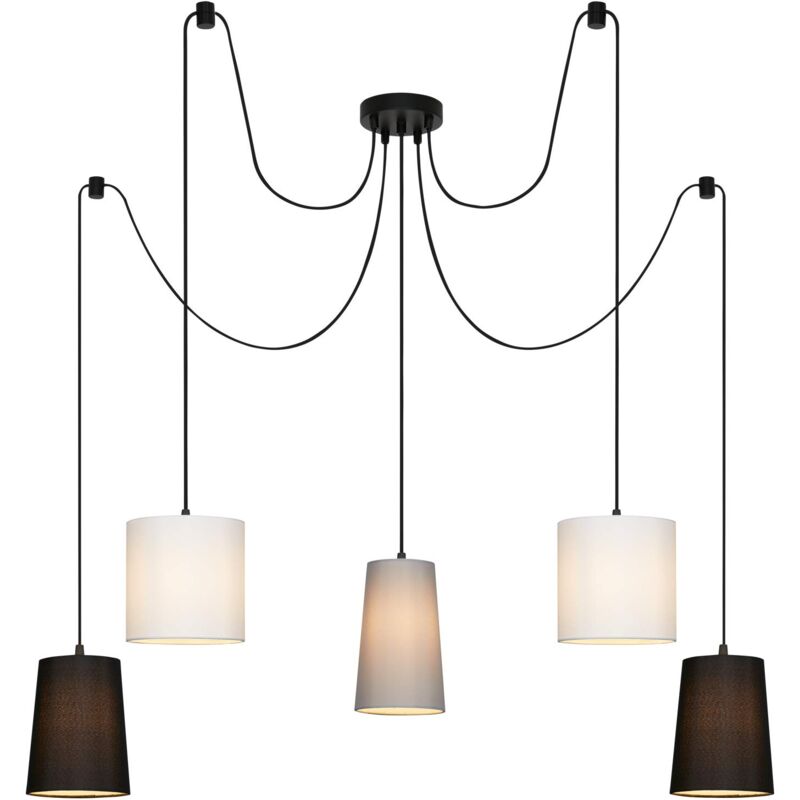 Questa lampada da soffitto in metallo-plastica si adatta perfettamente a tutti gli ambienti grazie al suo design moderno ed attira l'attenzione ovunque. E' estremamente versatile, ad esempio come lampada da sala da pranzo o in soggiorno. La plafoniera ha due paralumi cilindrici (bianchi) e tre conici (2x neri, 1x grigi) che possono essere fissati in modo variabile - puoi scegliere tu stesso la luminosità e il colore della luce di questa lampada e quindi adattare liberamente l'illuminazione nelle tue stanze. La potenza massima per questa lampada a sospensione è di 5x 25 Watt (attacchi E14) - le lampadine non sono comprese nella confezione. A causa della classe di protezione IP20 questa lampada è destinata esclusivamente all'uso in interni. Dimensioni del prodotto: 1.000x1.450mm (DxH), paralume: 120x25mm, lunghezza del cavo: 4 x 1800mm + 1 x 860mm