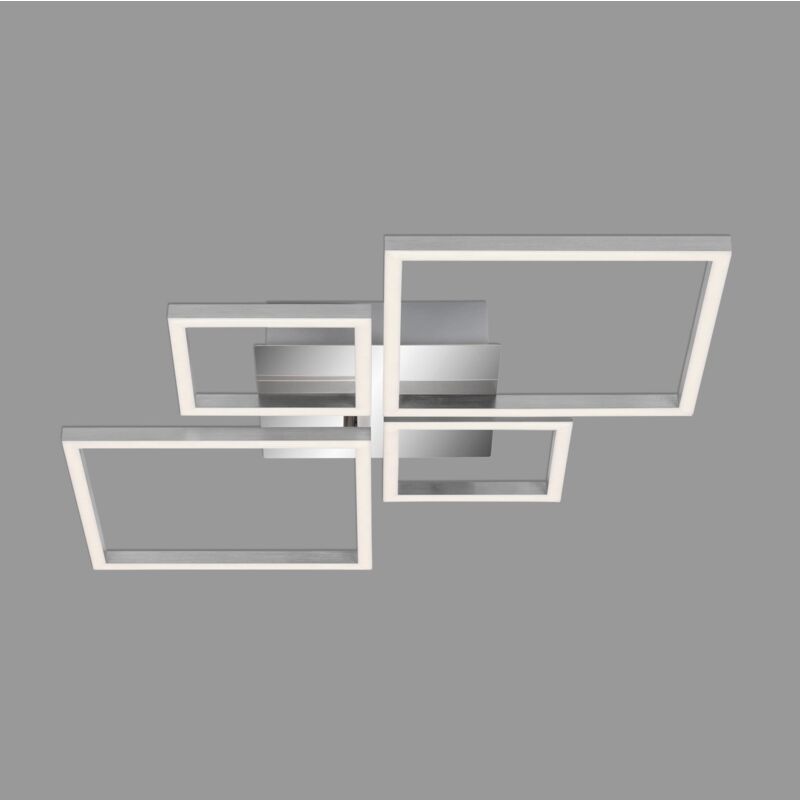 Moderna plafoniera a LED con quattro moduli quadrati a LED di colore argento cromato, realizzata in plastica e metallo. Il braccio girevole vi permette di orientare la luce come preferite - il design raffinato la rendono adatta a diversi ambienti, tra cui ad es. Il soggiorno, la camera da letto o la sala da pranzo. La plafoniera a LED con 48 watt a rirmio energetico, un flusso luminoso di 4000 lumen e una temperatura di colore di 3000 kelvin crea una piacevole atmosfera di benessere. Inoltre, questa moderna lampada offre una durata media di ca. 20.000 ore e ha diversi livelli di regolazione della luce. Dimensioni del prodotto: 750 x 470 x 73 mm (lunghezza x larghezza x altezza).