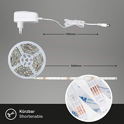 Briloner Leuchten - Striscia a LED, luce LED 5m, autoadesiva, accorciabile, dimmerabile, incl. telecomando, WIFI, controllo da app, Amazon ECHO, funzione cambio colore, bianco, 5.000x10x3mm (LxPxH)