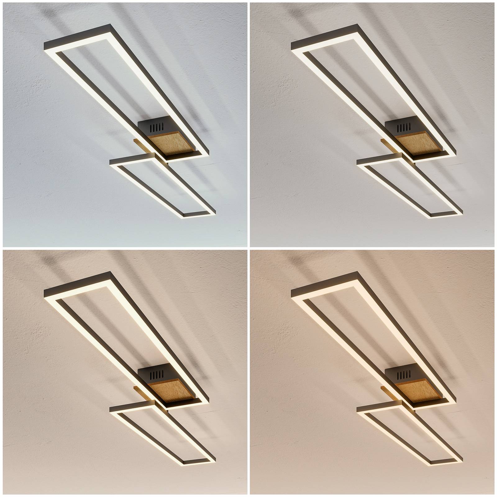 Plafoniera a LED Frame con due paralumi rettangolari e rosone in legno sulla calotta La plafoniera a LED Frame valorizza qualsiasi ambiente con il suo design. Le strette cornici rettangolari (dotate di LED) poggiano su un angolare rosone in legno. La plafoniera non colpisce solo per il suo linguaggio di design purista, ma anche per l'alto livello di funzionalità. La fornitura comprende un telecomando con il quale è possibile selezionare il colore di luce nella gamma da 2.700 K a 5.000 K. Anche la funzione di luce notturna dell'apparecchio può essere impostata tramite telecomando, così come il Tim.