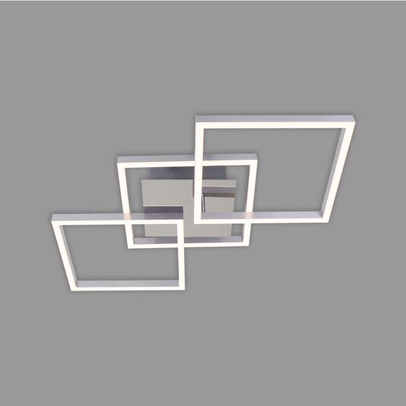 Descrizione Moderna plafoniera a LED con tre moduli quadrati a LED (di cui uno girevole), di colore argento cromato, realizzata in plastica e metallo. Il suo design raffinato la rendono versatile e adatta a diversi ambienti, tra cui ad es. Il soggiorno, la camera da letto o la sala da pranzo. La plafoniera a LED con 30 watt a rirmio energetico, un flusso luminoso di 3900 lumen e una temperatura di colore di 3000 kelvin crea una piacevole atmosfera di benessere. Inoltre, questa moderna lampada offre una durata media di ca. 20.000 ore e ha diversi livelli di regolazione della luce. Dimensioni del prodotto: 763 x 368 x 73 mm (lunghezza x larghezza x altezza).