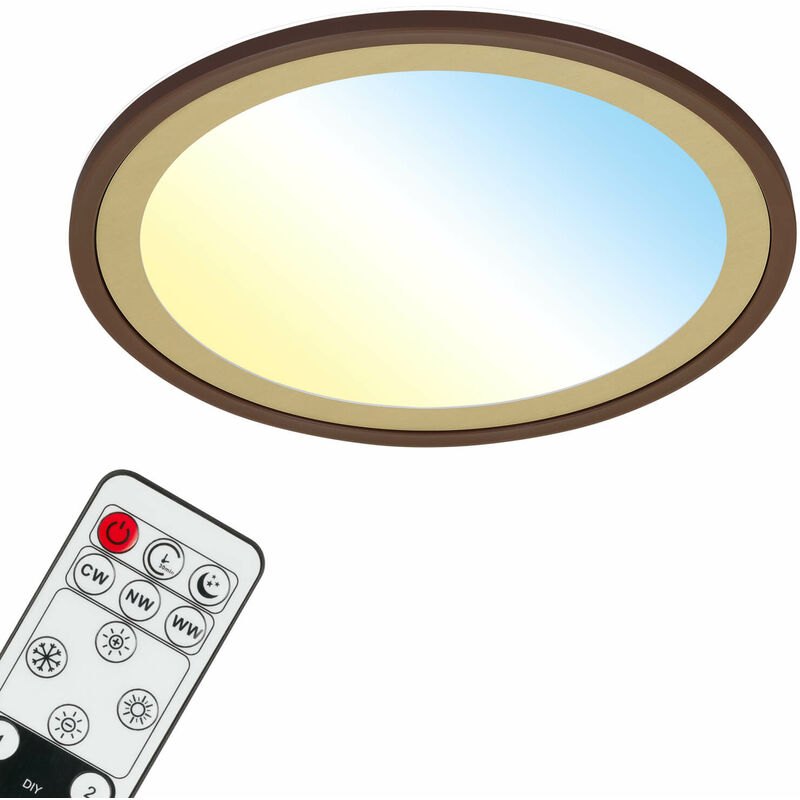 I punti forti di questa lampada da ufficio a LED sono da un lato l'altezza estremamente piatta di 2,9 cm, e dall'altro un accattivante effetto retroilluminato, che crea una bella luce indiretta sul soffitto del soggiorno. Questa moderna lampada a LED ha un bordo stretto in marrone e una superficie decorativa in tono oro all'interno. Con 3000 lumen, l'apparecchio è molto luminoso e ideale per corridoi, cucine o uffici domestici. Una funzione CCT permette di regolare la temperatura del colore individualmente. Scegli tra bianco caldo, bianco neutro e luce bianca fredda (2700-6500 K) per soggiorno, camera da letto e sala da pranzo. Le funzioni possono essere attivate comodamente sulla lampada da camera a LED tramite il telecomando. Convinciti del dimming infinitamente variabile, del cambio di temperatura di colore infinitamente variabile (da bianco caldo a bianco freddo), del timer di 30 minuti e della funzione di luce notturna (luce calda e soffusa).