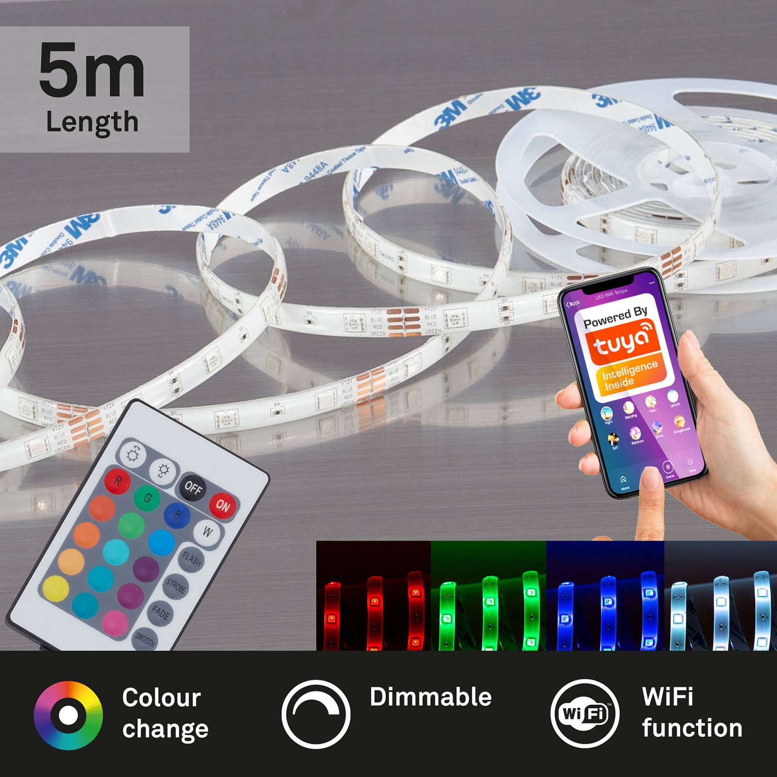 Striscia LED intelligente e accorciabile con telecomando - compresa la linea di alimentazione, il driver e il controllo remoto - 5 m di lunghezza, la striscia autoadesiva può essere accorciata ogni 10 cm - operabile tramite l'app Tuya, Amazon Echo e Google Home - vari programmi di colore/effetti di luce selezionabili