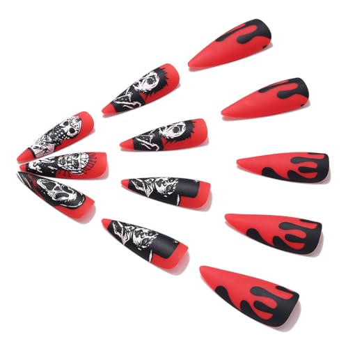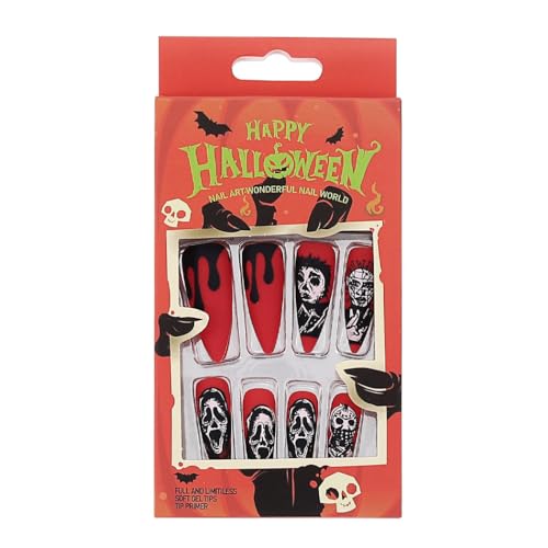 Brishow Unghie finte a forma di bara, decorazioni per Halloween, a pressione, con teschio e sangue, unghie finte lunghe in acrilico, 24 pezzi, per donne e ragazze