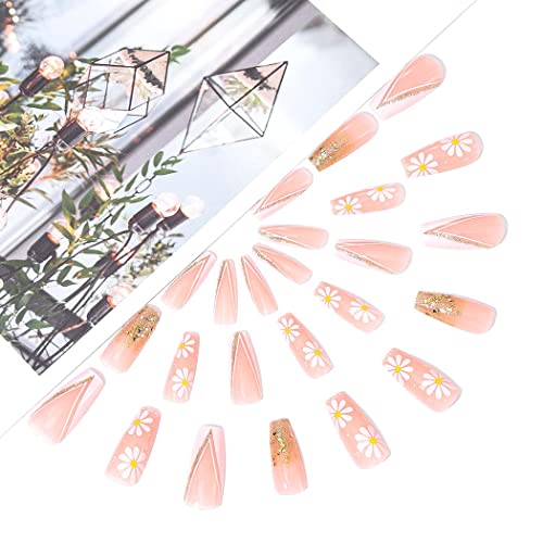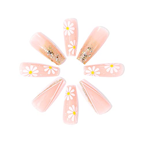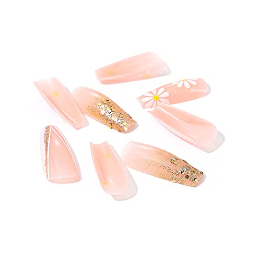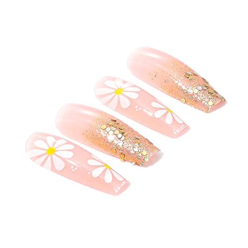 Brishow Unghie finte francesi rosa lunghe unghie finte dorate con paillettes a pressione sulle unghie a fiore 24 pezzi per donne e ragazze
