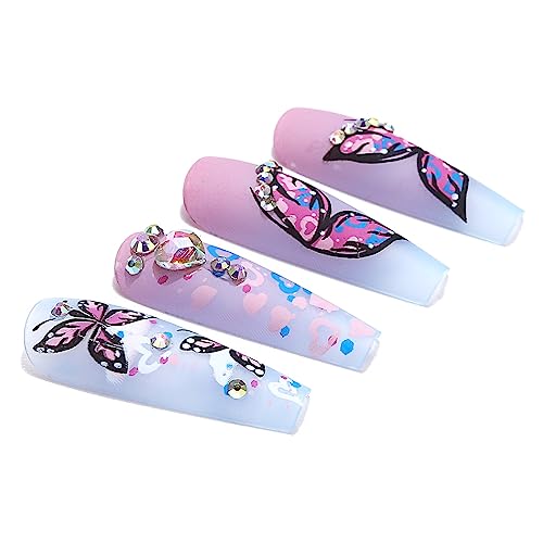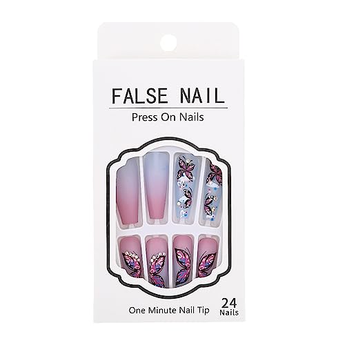 Brishow Unghie finte lunghe a forma di bara, a forma di farfalla, con cristalli, a pressione, viola, sfumate, in acrilico, 24 pezzi, per donne e ragazze