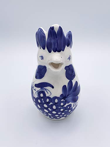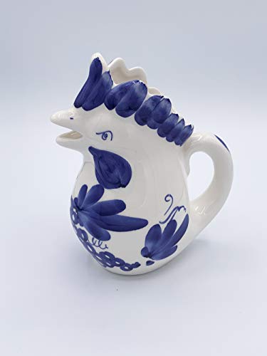 Brocca in ceramica a forma di gallo dipinta a mano con disegni romagnoli blu