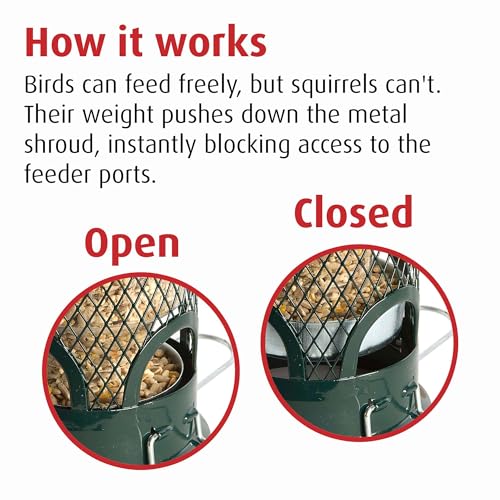 Il peso degli scoiattoli chiude lo sportello della mangiatoia prevenendo l'accesso alle granaglie.