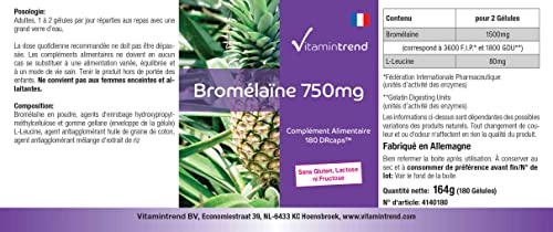 ✅ VITAMINTREND - QUALITÀ TEDESCA: Due capsule contiene: 1500mg Bromelain, corrisponde a 3600 F.I.P. e 1800 GDU - dose giornaliera consigliata: 1-2 DRcaps al giorno ripartite ai pasti con molta acqua - altamente dosato -ottimo rapporto qualità-prezzo.