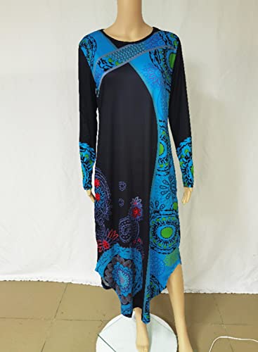 BRONG Abiti da donna a maniche lunghe vintage etnico stampato da donna abiti eleganti abito lungo sciolto con tasche, Blu, S