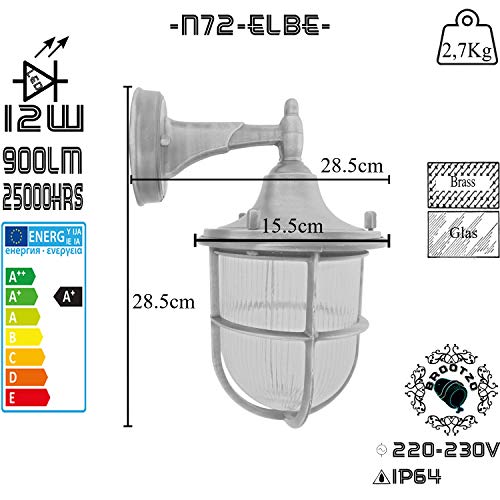 IP64, E27, Max. 60W, Projection: 28.5 L15.5 x Larghezza: 15.5 x Altezza:28.5 cm, Peso: 2.7kg / LED 12W 900LM
