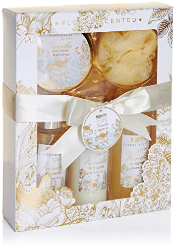 Il set alla vaniglia nella scatola con finestra stampata contiene 90 ml di gel doccia, 90 ml di bagnoschiuma, 90 ml di lozione per il corpo, 50 ml di scrub, una spugna esfoliante in nylon. Il set di cioccolato contiene 3 rose profumate, 120 ml di lozione per il corpo, 120 ml di gel doccia, 120 ml di bagnoschiuma, 1 spugna esfoliante, 2 sali da bagno da 80 g e un mobiletto in legno di 19 x 29 x 7,5 cm (L x A x P).