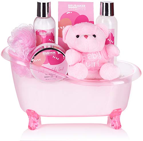 BRUBAKER Set 7 pezzi per la cura del bambino - Set di benvenuto per bambine - Set regalo per bambini con vasca e orsetto di peluche - Rosa