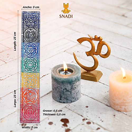BRUCIATORE INCENSO CHAKRAS - PESO 65 g Porta incenso lungo 23,5 cm, larghezza 3,2 cm e spessore 0,3 cm. Nota: considerando il suo carattere artigianale e che è alluminio, può avere irregolarità nell'aspetto.