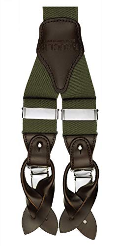BRUCLE bretelle uomo elastico e pelle doppio uso clip e bottoni, verde mililtare