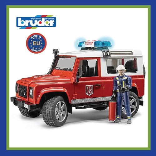 Bruder 02596 - Land Rover Defender Station Wagon con motore antincendio, pompiere, estintore, modulo luci e suoni