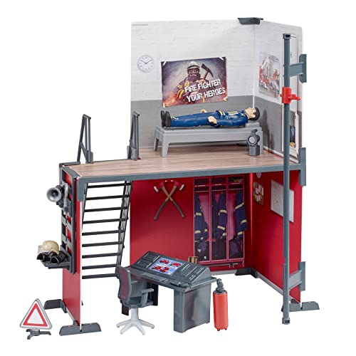 Riceverete il pompiere con accessori, la centrale operativa con sedia da ufficio e pannello di controllo, le scale con ringhiera e lo scaffale a muro con mensole e supporti