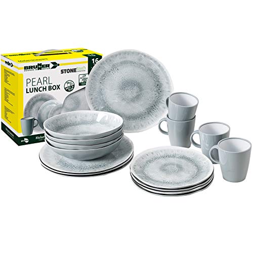BRUNNER Melamin Ess Geschirr Set Lunch Box 16-Teilig Camping Reise Teller Becher Stonetouch Pearl