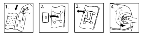 APPLICAZIONE - Aprire il supporto in dotazione e inserire il dischetto antiodore - Rimuovere la sospensione mobile sul retro e posizionarla al centro del supporto - Rimuovere la pellicola protettiva e fissare il supporto nella posizione desiderata