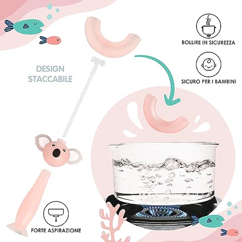 DESIGN A 360 A FORMA DI U: Questo design speciale si adatta perfettamente alla bocca del tuo piccolo permettendo alle setole di pulire denti e gengive da tutte le angolazioni. La testina piccola dello spazzolino permette al bambino di accettare facilmente lo spazzolino.