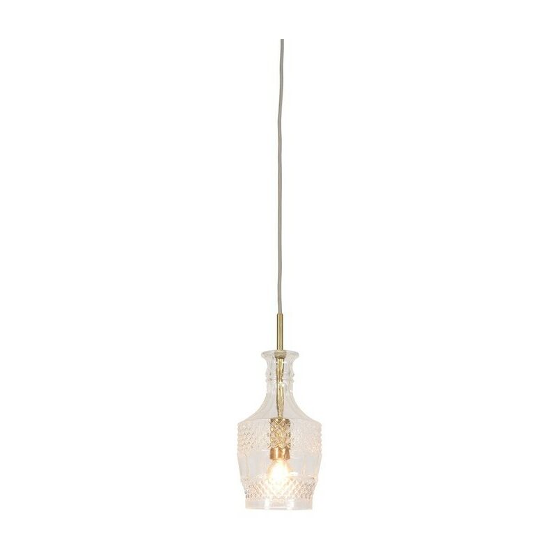 Lampada a sospensione in vetro trasparente con dettagli oro, tonda Attacco lampadina: E14 Max. wattaggio (W) 40 Materiale: vetro e ferro larghezza 13 cm Min/max altezza 30/285 cm Dimensioni rosone a soffitto 10 cm x 10 cm x 5 cm Materiale / colore cavo elettrico Tessuto / nero Lunghezza cavo elettrico 250 cm lampadina non inclusa