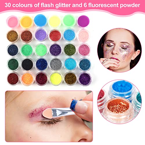 Brynnl Kit Tatuaggi Glitter, Set Tatuaggi Temporanei per Bambini 30 Colori Glitter, 207 Stencil, 2 Adesivi Perle in Resina e 2 Adesivi Cartoon, Trucco Glitter Festival per Ragazze Bambini