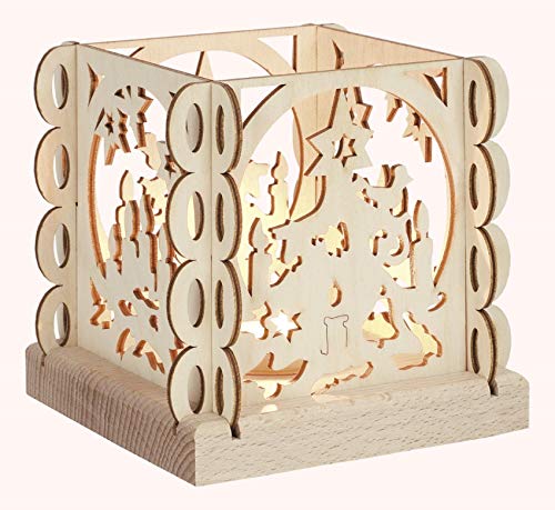 La piccola lanterna con motivo natalizio è una decorazione elegante. Il lavoro del seghetto da traforo mostra un albero di Natale con stella e candele, il tipico motivo natalizio evoca una sensazione accogliente.