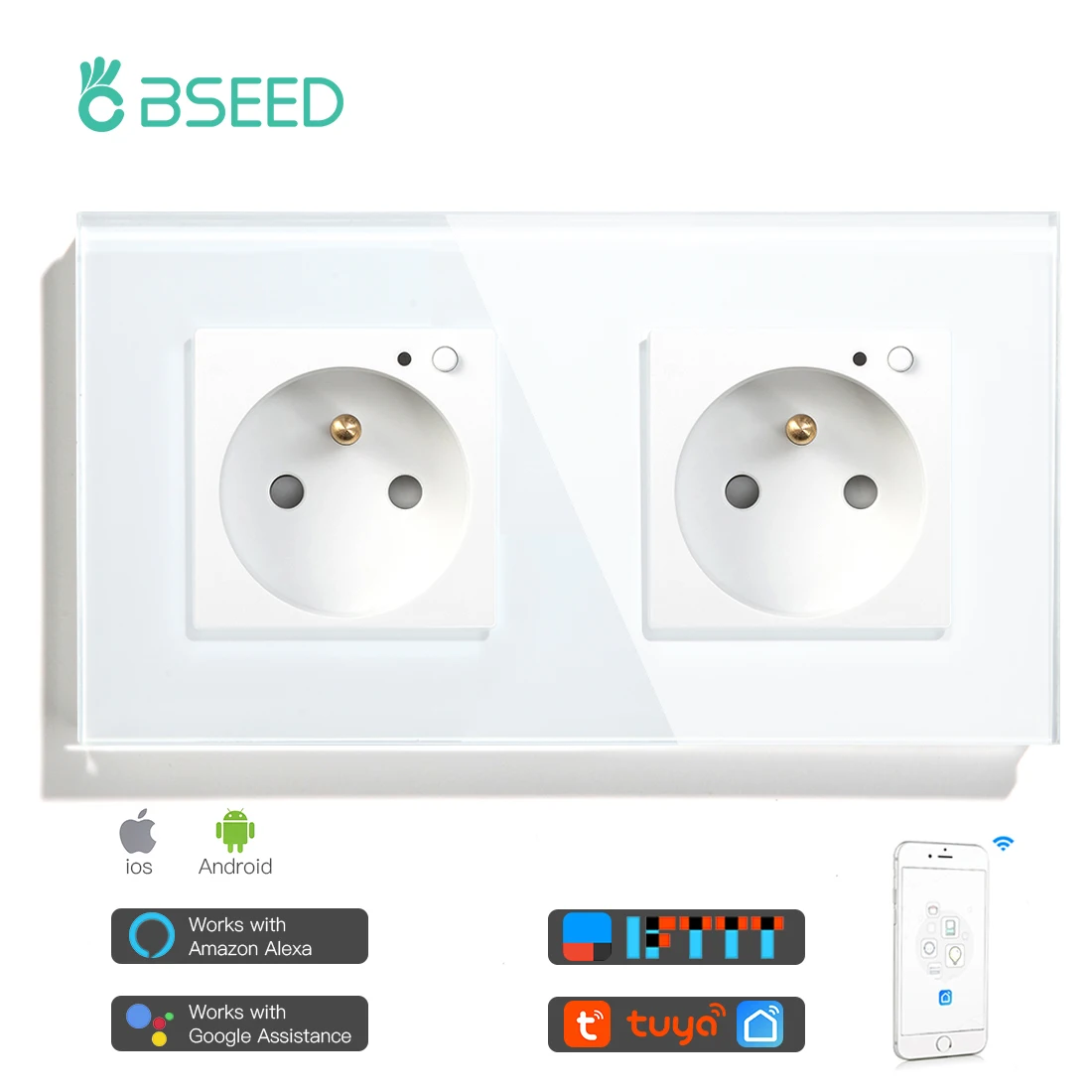 BSEED France Double Wall Sockets Wifi Control Glass Crystal Sockets Smart Socket Google Alexa Smart Life Tuya APP