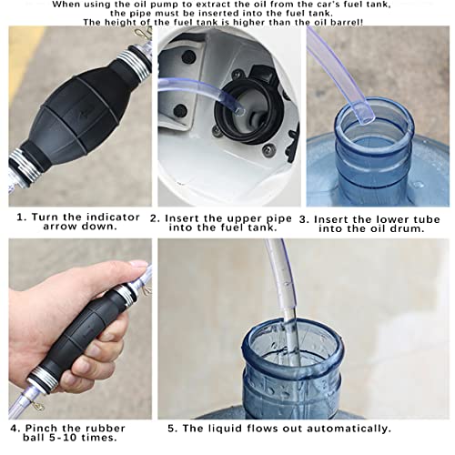 ⛽ 【Facile da Usare】 Inserire il tubo di ingresso dell'olio nella parte inferiore del serbatoio dell'olio, inserire il tubo di uscita dell'olio nel serbatoio dell'olio preparato, spremere la sfera di gomma 3-5 volte, il tubo dell'olio scaricherà automaticamente l'olio. Le valvole di ingresso e uscita dell'acqua integrate impediscono il riflusso, l'inalazione diretta entro 5 secondi e la freccia di direzione del flusso del liquido mostra la direzione del flusso.