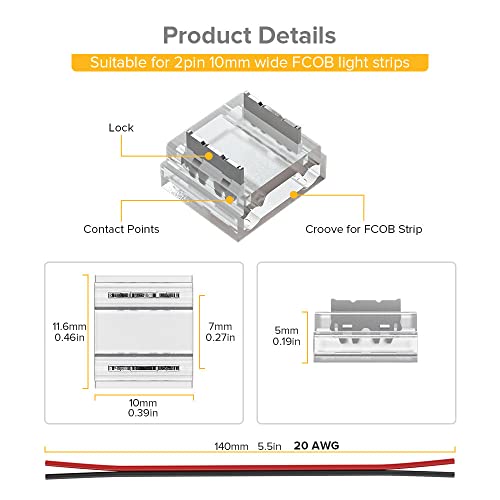 BTF-LIGHTING FCOB COB 10mm Kit di connettori 14pcs connettore trasparente 5pcs 15cm lungo 20AWG fili di estensione per non cablati senza saldatura,FCOB striscia di connessione angolare