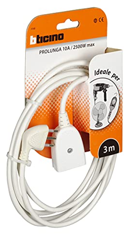 BTicino 2536B Prolunga Domestica, 3 x 0.75 mmq, Lunghezza 3 m con Spina e Presa 2P+T, 10A, 2500 W, 250 V, Bianco