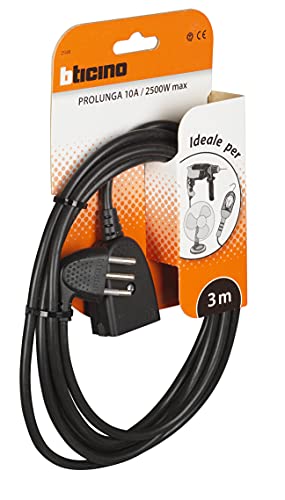 BTicino 2536N Prolunga Domestica, 3 x 0.75 mmq, Lunghezza 3 m con Spina e Presa 2P+T, 10A, 2200 W, 250 V, Nero